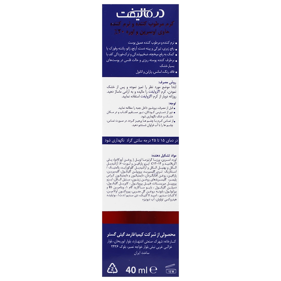 کرم مرطوب کننده و نرم کننده حاوی اوره 20 درصد درمالیفت مناسب پوست خیلی خشک 40 میلی لیتر