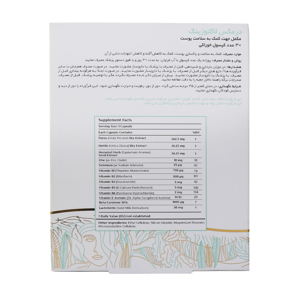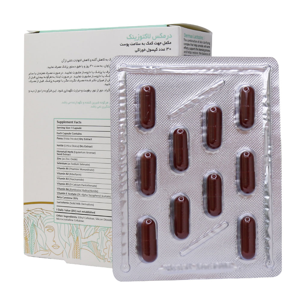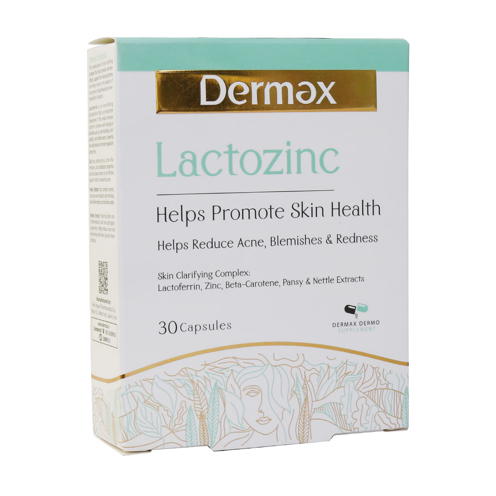 کپسول لاکتوزینک درمکس با داشتن ترکیبات گیاهی و ویتامینهای مورد نیاز بدن به سلامت و پاکسازی پوست کمک میکند. همچنین لاکتوزینک در بهبود التهابات ناشی از آکنه، تاثیر بسزایی دارد. لاکتو زینک را میتوان بهترین مولتی ویتامین برای پوست دانست، چرا که دارای ریزمغذیهایی بوده که باعث ساخت کلاژن و افزایش استحکام پوست و حفاظت از سلولهای پوست، مو و ناخن میشوند. مزیت اصلی لاکتوزینک درمکس به عنوان قرص برای تقویت پوست و مو این است که این قرص توسط جریان خون، مواد مغذی را به عمیق ترین قسمتهای پوست هدایت میکند.
