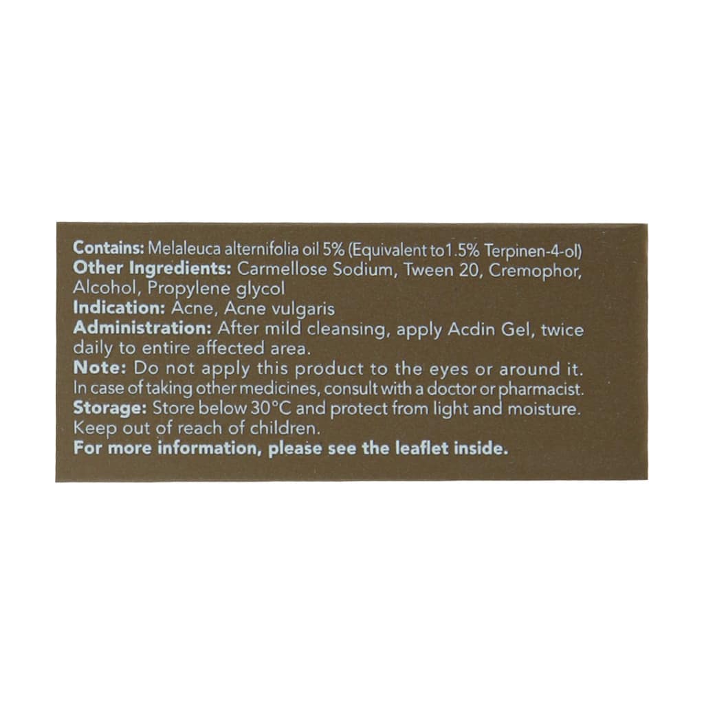 ژل ضد جوش و آکنه آکدین دینه حاوی 5 درصد اسانس درخت چای است که در درمان موارد خفیف تا متوسط آکنه ولگاریس کارایی دارد. حتی در موارد شدید نیز به عنوان درمان کمکی شناخته شده است.