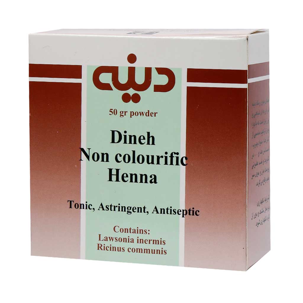 حنای بدون رنگ دینه محصولی با خواص درمانی، تقویت کننده و ضد عفونی کننده پوست بدن و موی سر است. در واقع رنگ قرمز این حنای طبیعی و معمولی جدا شده و بی رنگ است.