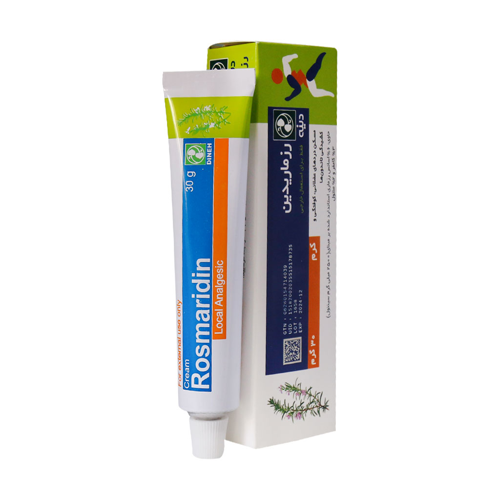 کرم رزماریدین دینه یک ضد درد موضعی گیاهی است که به عنوان کمک درمان مناسبی جهت دردهای روماتیسمی و همچنین دردهای عضلانی و مفاصل، کشیدگی تاندونها و در رفتگی (بخصوص در ورزشکاران) کاربرد دارد. خواص گیاه رزماری بر کسی پوشیده نیست و این فراورده با دارا بودن مقادیر قابل توجهی از این اسانس، میتواند مرهمی بر دردهای عضلانی، کوفتگی و کشیدگی باشد.