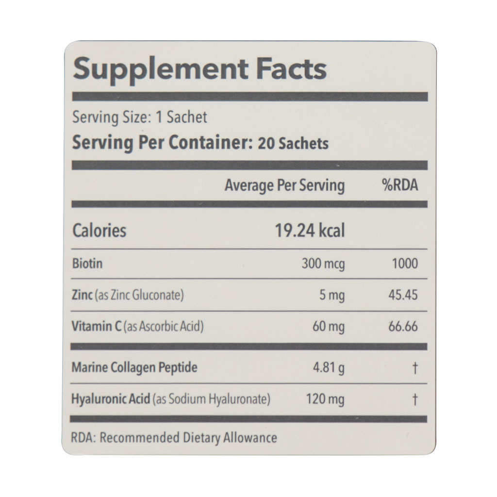 - کلاژن: کلاژن به کار رفته در این محصول از منبع دریایی است. پپتیدهای کلاژن ماهی به اصطلاح پپتیدهای کلاژن نوع یک هستند. این نوع کلاژن فراوانترین کلاژن در بدن انسان به شمار میآید. مزیت آن، جذب و فراهمی زیستی بیشتر آن است. کلاژن نوع یک سنگ بنای پوست زیبا، بافتهای همبند انعطاف پذیر و استخوانهای قوی است.