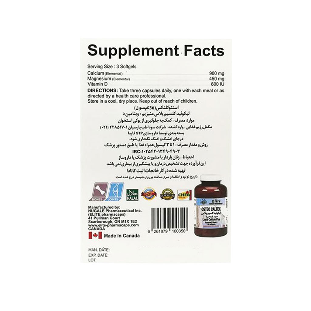کپسول استئو کلتکس لیکوئید کلسیم پلاس الیت یک قرص کلسیم دی منیزم است. کلسیم و ویتامین D به تقویت استحکام استخوانها و دندانها کمک شایانی مینماید. منیزیم نیز علاوه بر کمک به تشکیل استخوانها باعث کاهش درد و گرفتگی عضلات نیز میشود. قابل ذکر است این محصول از بدن در مقابل بیماریهای قلبی عروقی، پوکی استخوان و برخی دیگر از بیماریها محافظت میکند. قرص osteo caltex برای افرادی که از طریق رژیم غذایی کلسیم، منیزیم و ویتامین D کافی دریافت نمیکنند و یا کسانی که در معرض کافی تابش نور خورشید نیستند، بسیار مفید خواهد بود.