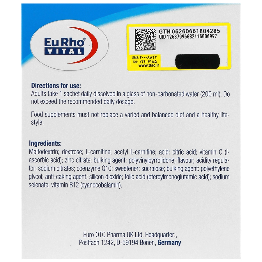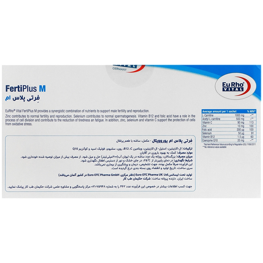 ساشه فرتی پلاس ام یوروویتال با داشتن ترکیبات موثر و مفید مانند ال کارنیتین، زینک، ویتامین سی، سلنیوم و … به بهبود باروری، سلامت اسپرماتوژنز و تولید مثل آقایان کمک میکند.