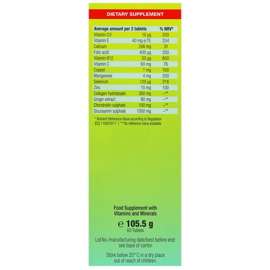 گلوکوزامین سولفات 2 پتاسیم کلرید، کلسیم کربنات، کلاژن دریایی هیدرولیز شده، مواد پر کننده میکرو کریستالین سلولز، منگنز سولفات، ویتامین E، کندروئیتین سولفات، امولسیفایر اسید سیتریک، عصاره زنجبیل، ویتامین C، مواد پر کننده هیدروکسی پروپیل سلولز، مواد هیدروکسی پروپیل متیل سلولز، زینک اکسید، مواد پوشش دهنده سدیم کربوکسی متیل سلولز (کروس کارملوس سدیم)، مواد جدا کننده منیزیم ستئارات، رنگ تیتانیوم دی اکسید، ویتامین B12، سیلیکون دی اکسید، سدیم سلنات، مواد جاذب گلیسرول، تالکوم، ویتامین D3، سولفات مس، مواد جلادهنده کارنائوباواکس، فولیک اسید