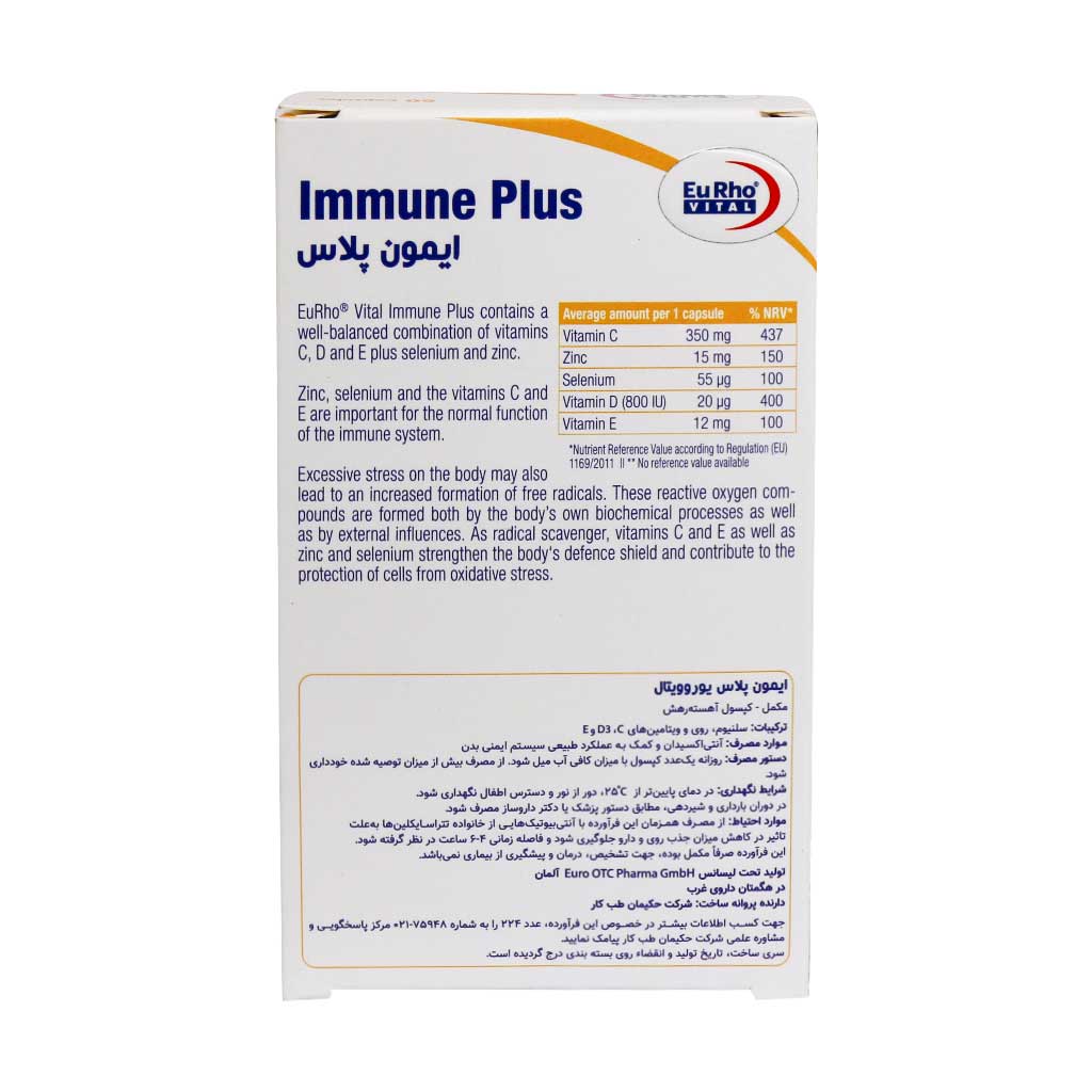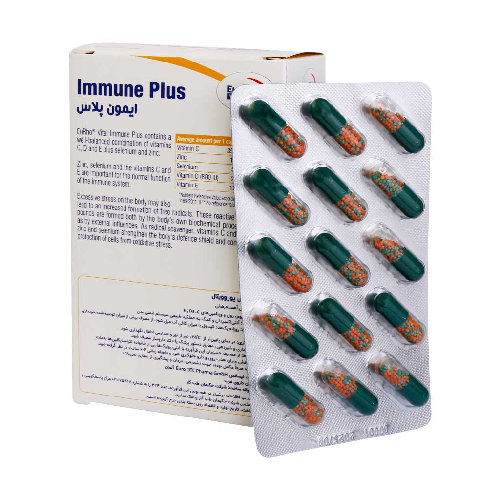 کپسول ایمون پلاس یوروویتال حاوی ترکیبی متعادل از ویتامینهای C، D و E به علاوه سلنیوم و روی است. روی، سلنیوم و ویتامینهای نام برده شده جهت عملکرد طبیعی سیستم ایمنی بسیار حائز اهمیت هستند. وارد شدن استرس زیاد بر بدن انسان ممکن است منجر به افزایش رادیکالهای آزاد شود. این ترکیبات مضر هم از طریق فرایندهای بیوشیمیایی در بدن و هم توسط عوامل خارجی ایجاد میشوند. اما خوشبختانه ویتامین ث و ای، همچنین روی و سلنیوم به عنوان مهار کننده رادیکال، سیستم دفاعی بدن را تقویت میکنند. بدین صورت از سلولها در برابر استرس اکسیداتیو محافظت مینمایند. کپسول آهسته رهش ایمون پلاس موجب شده تا ترکیبات موجود در این قرص تقویت سیستم ایمنی بدن به آهستگی آزاد شوند. در نتیجه ویتامینها و مواد معدنی جذب بالاتری داشته و بهتر مورد استفاده بدن قرار میگیرند.