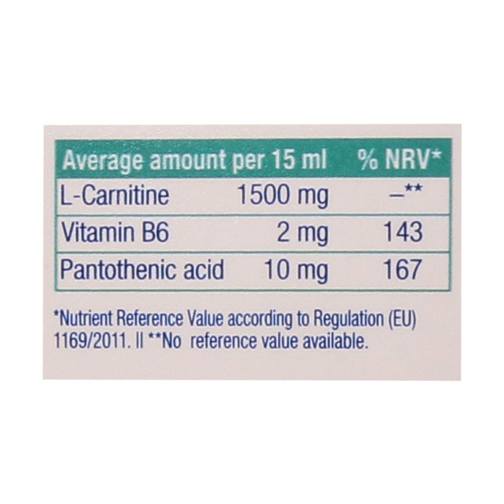- حاوی ال کارنیتین، ویتامین B6، ویتامین B5