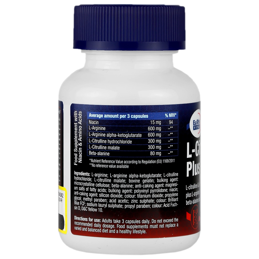 مکمل السیترولین پلاس یوروویتال، حاوی 300 میلی گرم ال سیترولین هیدروکلراید، 300 میلی گرم ال سیترولین مالات، 600 میلی گرم ال آرژنین، 600 میلی گرم آرژنین آلفاکتوگلوتارات، 80 میلی گرم بتاآلانین و 15 میلی گرم نیاسین در هر سروینگ معادل 3 عدد کپسول است.