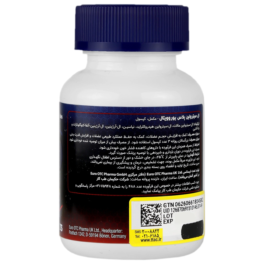 - ال سیترولین پلاس یوروویتال، حاوی ال-سیترولین هیدروکلراید، ال-سیترولین مالات، ال-آرژنین، آرژنین آلفاکتوگلوتارات، بتاآلانین و نیاسین