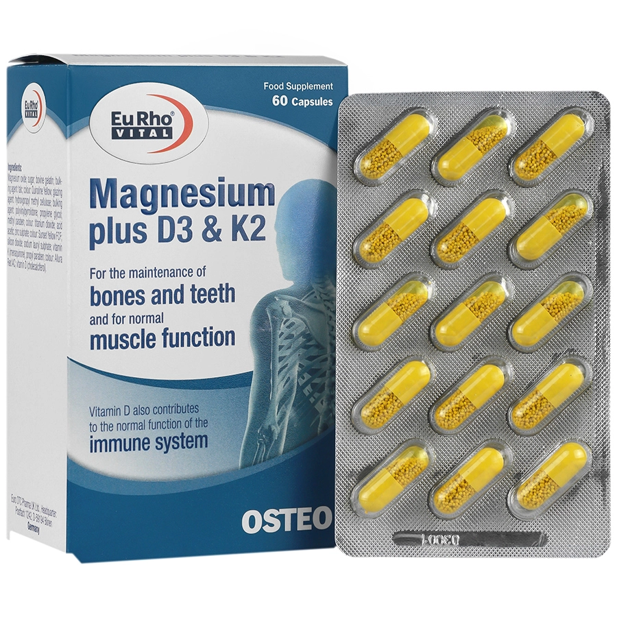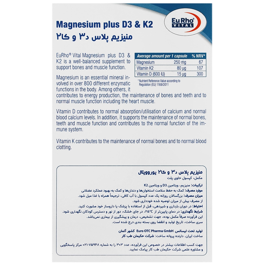 کپسول منیزیم پلاس د3 و کا2 یوروویتال 60 عددی