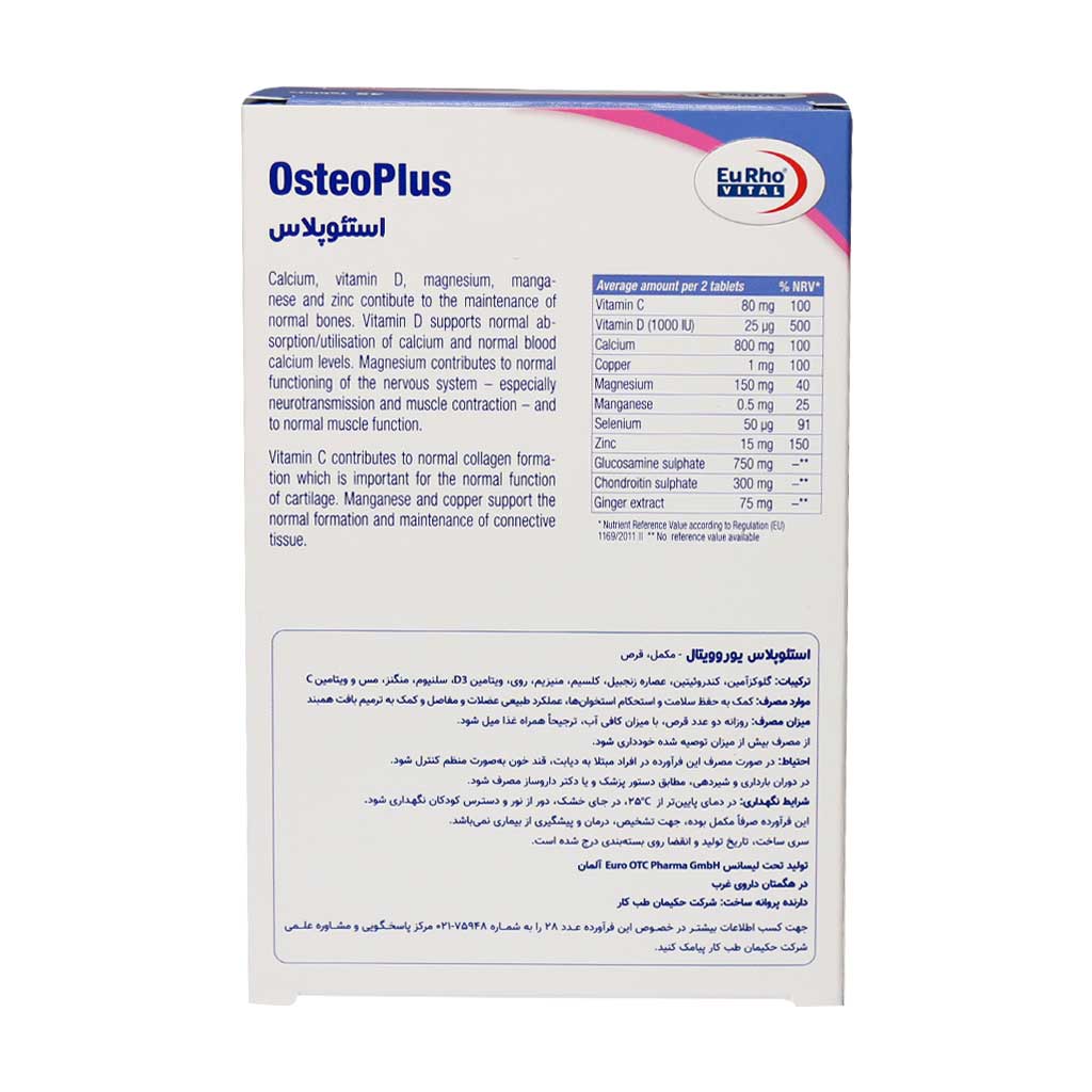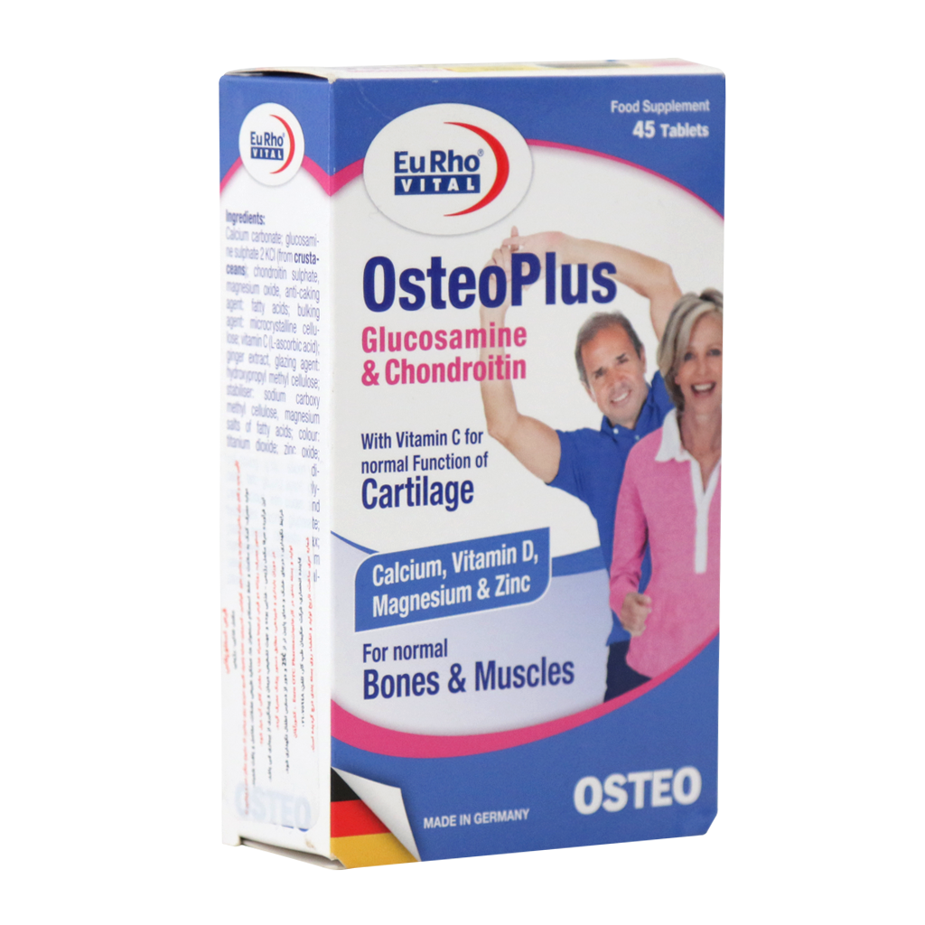 قرص استئوپلاس یوروویتال در حفظ سلامت استخوان ها و غضروف مفاصل نقش بسزایی دارد. این قرص از پوکی استخوان پیشگیری کرده و باعث حفظ تراکم استخوان ها می گردد، این محصول همچنین به عملکرد طبیعی عضلات، مفاصل و بافت همبند کمک کرده و باعث حفظ تراکم استخوان ها می گردد.