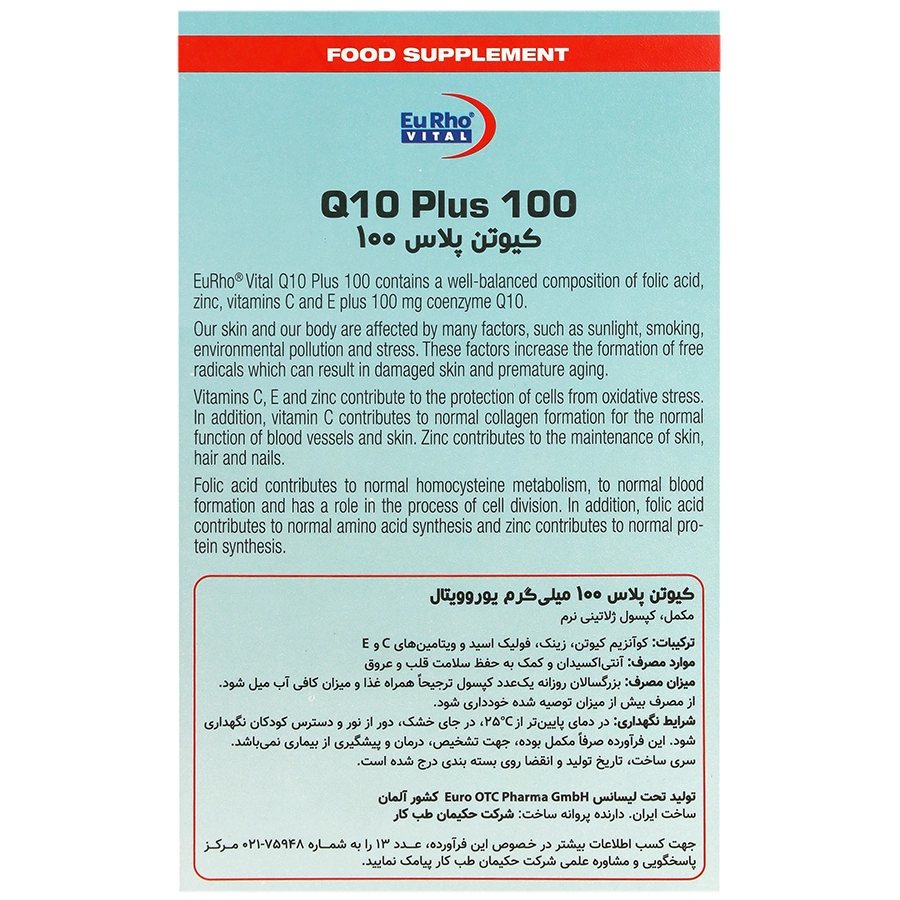 قرص کیوتن پلاس ۱۰۰ یوروویتال یک مکمل غذایی جهت حفظ سلامت قلب و عروق است. این محصول حاوی کوآنزیم کیوتن، زینک، فولیک اسید و ویتامینهای C و E است. زینک موجود در این مکمل کلسترول خون را کاهش داده و خطر ابتلا به بیماریهای قلبی را به طرز چشمگیری میکاهد. فولیک اسید نیز با کاهش اسیدهای آمینه از بروز سکته قلبی در افراد جلوگیری میکند. پیشگیری از کمبود آهن، تسریع روند بهبود زخم و ممانعت از انسداد رگها از جمله فواید ویتامینهای C و E موجود در این قرص است.