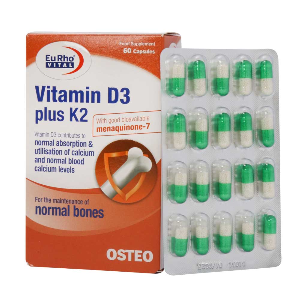 کپسول ویتامین D3 1000 پلاس K2 یوروویتال با داشتن دوز مناسبی از دو ویتامین د3 و کا2 محصولی مناسب جهت حفظ سلامت استخوان است. ویتامین د3 موجود در این محصول جذب کلسیم را در بافت دندانی و استخوانی افزایش می‌دهد و همین امر سبب شده است تا خطر ابتلا به بیماری‌های استخوانی از جمله پوکی استخوان کاهش پیدا کند. علاوه بر این، ویتامین K2 در استخوان سازی، پیشگیری از رسوب کلسیم در عروق خونی نقش موثری دارد و در حفظ سلامت قلب و عروق موثر است. خوشبختانه ساختار قرص ویتامین د3 به صورت آهسته رهش است و جذب و اثربخشی بالاتر و عوارض گوارشی کمتری دارد.