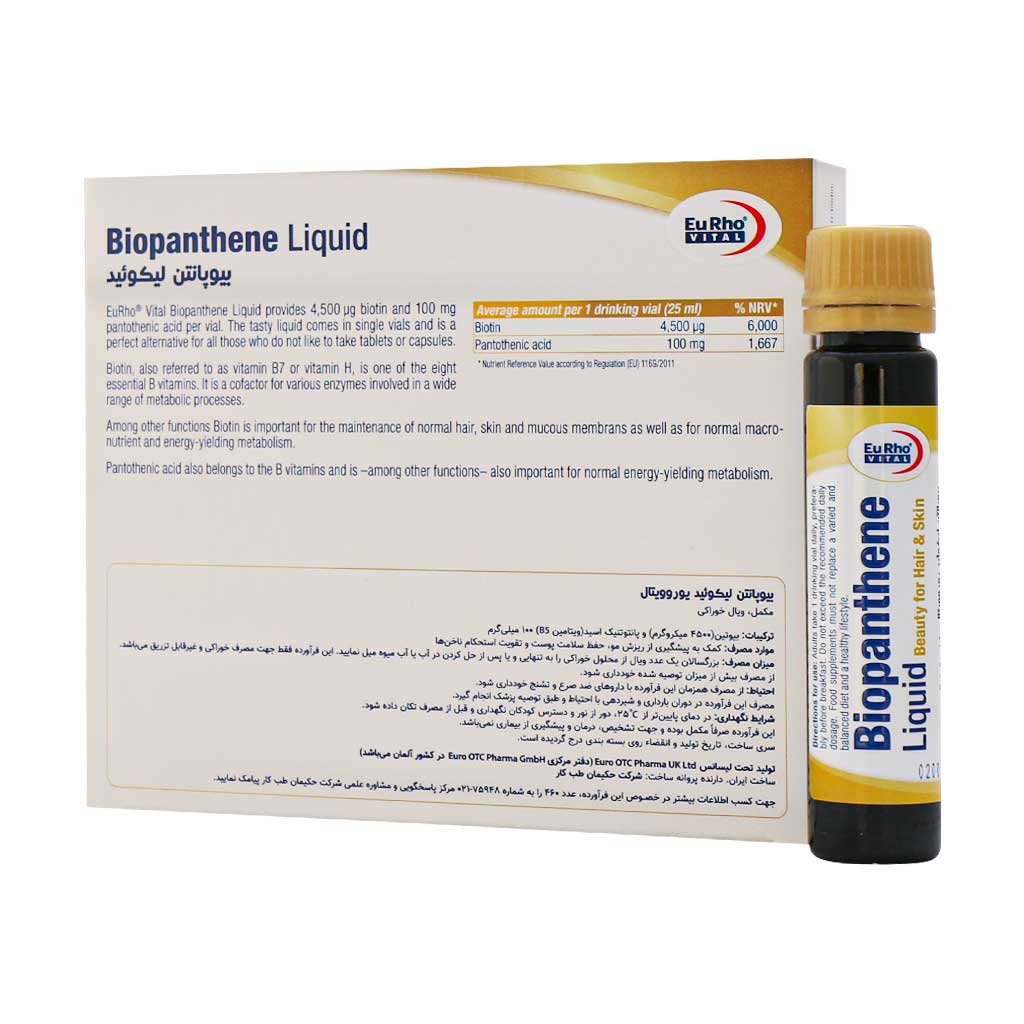 ویال بیوپانتن لیکوئید یوروویتال حاوی 4500 میکروگرم بیوتین و 100 میلی گرم پانتوتنیک اسید در هر ویال است. این مقدار بیوتین و ویتامین B5 میتوانند ضامن سلامتی پوست، مو و ناخنهای شما باشند. درست است که هردوی این ویتامینها اثرگذاری مشابهی دارند، اما به صورت تخصصیتر بیوتین برای موها به کار میرود و با تقویت ساختار مو از ریزش آنها جلوگیری میکند. همچنین قرص بیوتین میتواند افزایش ضخامت موها را به دنبال داشته باشد و آسیبهای وارد شده بر ناخنها را ترمیم کند و باعث افزایش استحکام آنها شود.
