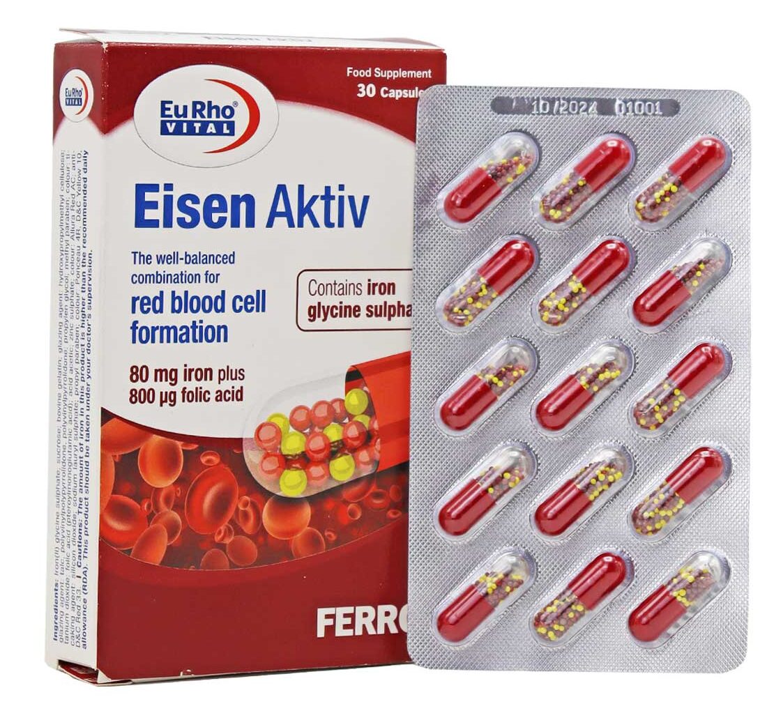 همچنین این ترکیب باعث انتقال طبیعی اکسیژن در بدن و کاهش ضعف و خستگی و متابولیسم طبیعی انرژی می‌شود. فولیک اسید به کار رفته در کپسول آیزن اکتیو یورو ویتال نیز به خونسازی طبیعی کمک می‌کند. به همین خاطر استفاده از این فراورده به کسانی که دچار کم خونی ناشی از فقر آهن هستند توصیه می‌شود.