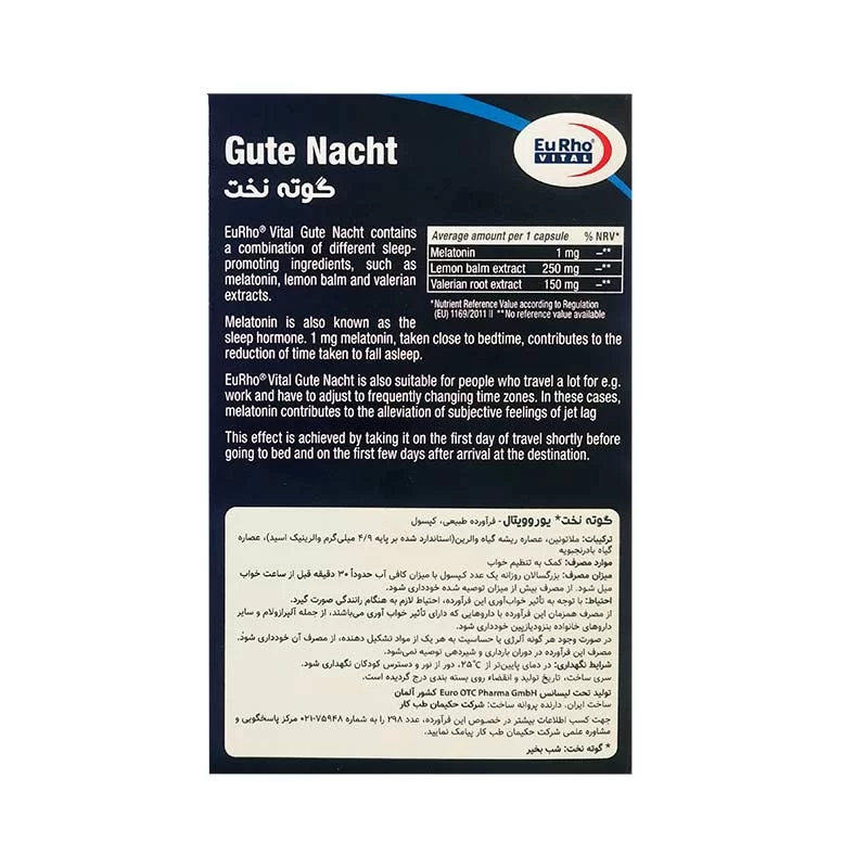 کپسول گوته نخت یوروویتال Eurhovital Gute Nacht یک مکمل تنظیم کننده ساعت خواب از محصولات یوروویتال است. قرص گوته نخت یوروویتال حاوی 3 ترکیب مهم برای ایجاد آرامش قبل از خواب و همچنین کمک به داشتن خوابی با کیفیت تر می باشد. معنی تحت لفظی گوته نخت به معنای شب بخیر است که نشان دهنده کمک این مکمل به داشتن خواب بهتر است.