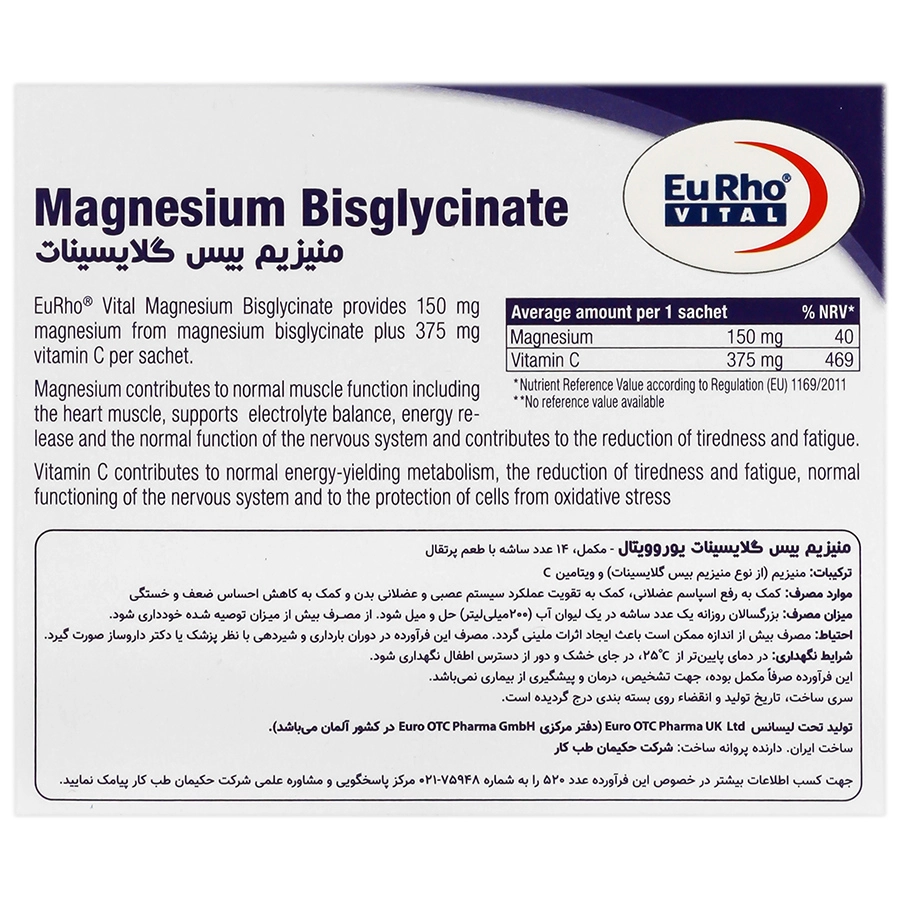 ساشه منیزیم بیس گلایسینات یوروویتال تحت لیسانس آلمان یکی از بهترین و پیشرفتهترین مکملهای منیزیم در بازار است که به منظور تامین این مینرال در بدن تولید شده است. منیزیم با فرم بیس گلایسینات با جذب بالا و عوارض گوارشی کمتر به کاهش اسپاسمهای عضلانی، بهبود کیفیت خواب، سلامت سیستم عصبی، تسکین علائم سندروم پیش از قاعدگی کمک میکند و افرادیکه در طول روز سخت مشغول کارند و به ویژه ورزشکاران میتوانند از آن استفاده کنند. در این محصول از ویتامین سی جهت جذب بهتر منیزیم و کاهش خستگی به واسطه خواص آنتی اکسیدانی استفاده شده است.