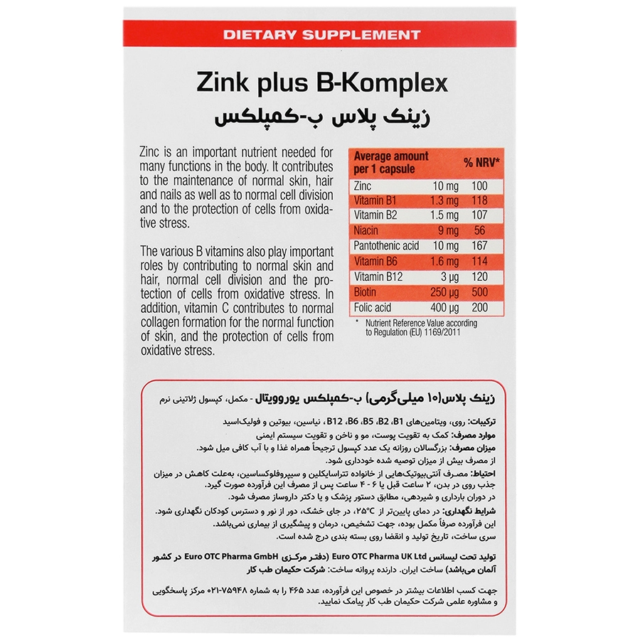 ترکیبات کپسول زینک پلاس ب کمپلکس یوروویتال