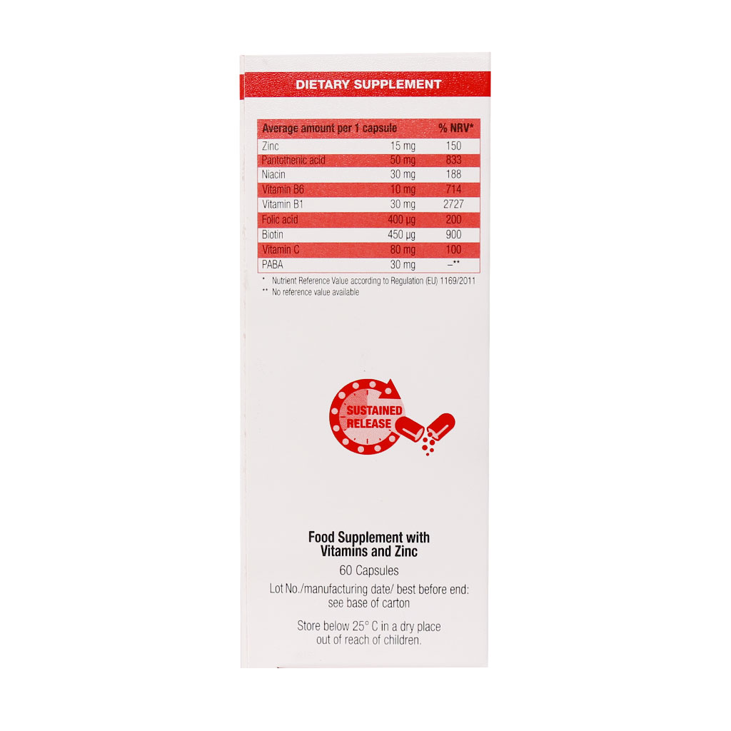 روی، پارا آمینو بنزوئیک اسید، بیوتین، ویتامین B5، نیاسین، فولیک اسید، ویتامین B1، ویتامین B6، ویتامین C.