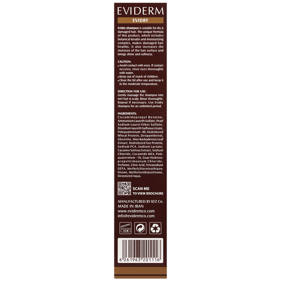 شامپو اویدرای اویدرم مناسب موهای خشک و آسیب دیده و با بهره گیری از ماده اولیه کراتینه با منشا گیاهی، رطوبت رسان و حاوی ویتامین B5 است و در درمان موخوره و بازسازی و تغذیه موهای خشک و آسیب دیده موثر است.