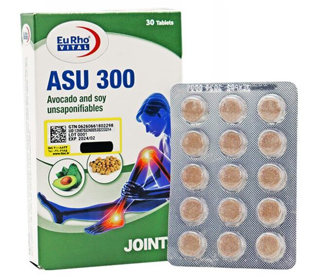 قرص آسو 300 یوروویتال با منشا گیاهی حاوی 300 میلی گرم عصاره غیرصابونی شده آووکادو و سویا با نسبت 1 به 2 است. این قرص با تحریک ساخت کلاژن و پروتئوگلیکان باعث بازسازی غضروف، کاهش سرعت پیشرفت استئوآرتریت و کاهش دردهای مفصلی میشود و به بهبود علائم آرتروز و کاهش درد در ورزشکاران آسیب دیده کمک میکند. میتوان گفت قرص آسو یورو ویتال حاوی آووکادو و روغن دانه سویا یک مکمل گیاهی ایمن جهت حفظ سلامت مفاصل و غضروفها است. استفاده از این مکمل نیاز به مصرف داروهای کاهنده درد از جمله NSAIDs را کاهش میدهد.