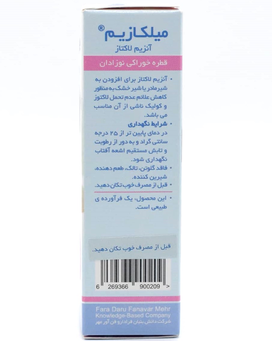قطره میلکازیم فرابیوتیک، فرآورده خوراکی شرکت فرادارو فن آور مهر حاوی آنزیم گوارشی لاکتاز بوده و در راستای کمک به تسهیل هضم قند لاکتوز در نوزادان تازه به دنیا آمده و کاهش کولیک و عوارض گوارشی ناشی از عدم تحمل لاکتوز، با فرمولاسیونی فاقد هر گونه طعم دهنده، شیرین کننده، تالک و گلوتن به بازار آمده است. قطره میلکازیم در بطری های شیشه ای 15 میلی لیتری دارای قطره چکان عرضه شده و از بدو تولد نوزادان قابل استفاده است.