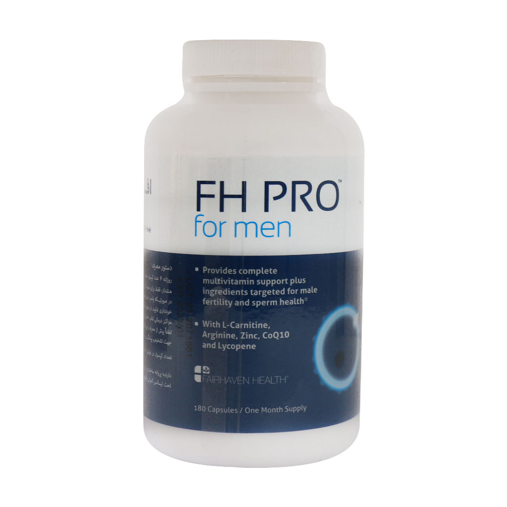Fh Pro برای مردان دو منظوره است و از آن برای دستیابی به اهداف سلامتی و باروری استفاده میشود. این مکمل یک مولتی ویتامین جامع برای رفع کمبودهای مواد مغذی در رژیم غذایی روزانه شما، همراه با مواد هدفمند باروری مانند ال کارنیتین، ال آرژنین و کوآنزیم کیوتن است. در نهایت شایان ذکر است این کپسول در بسته بندی 180 عددی و تحت لیسانس شرکت فرهیون هلث آمریکا و در ایران بسته بندی و تولید شده است.