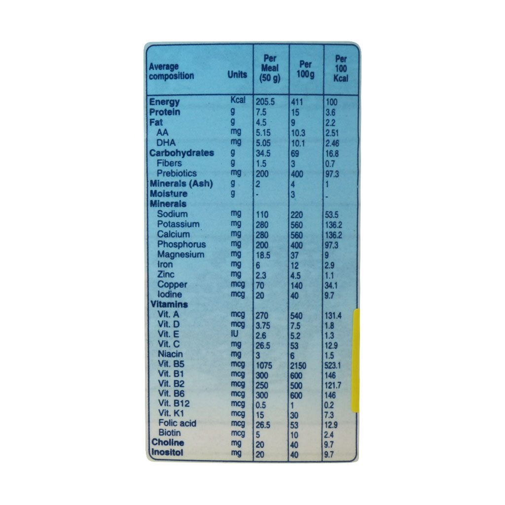 آرد گندم، شیر بدون چربی، روغن گیاهی، ساکارز، انواع پری بیوتیکها، ویتامینها، طعم دهنده وانیل، اسید آراشیدونیک و اسید دوکوزاهگزانوئیک (روغن ماهی)، کولین، اینوزیتول
