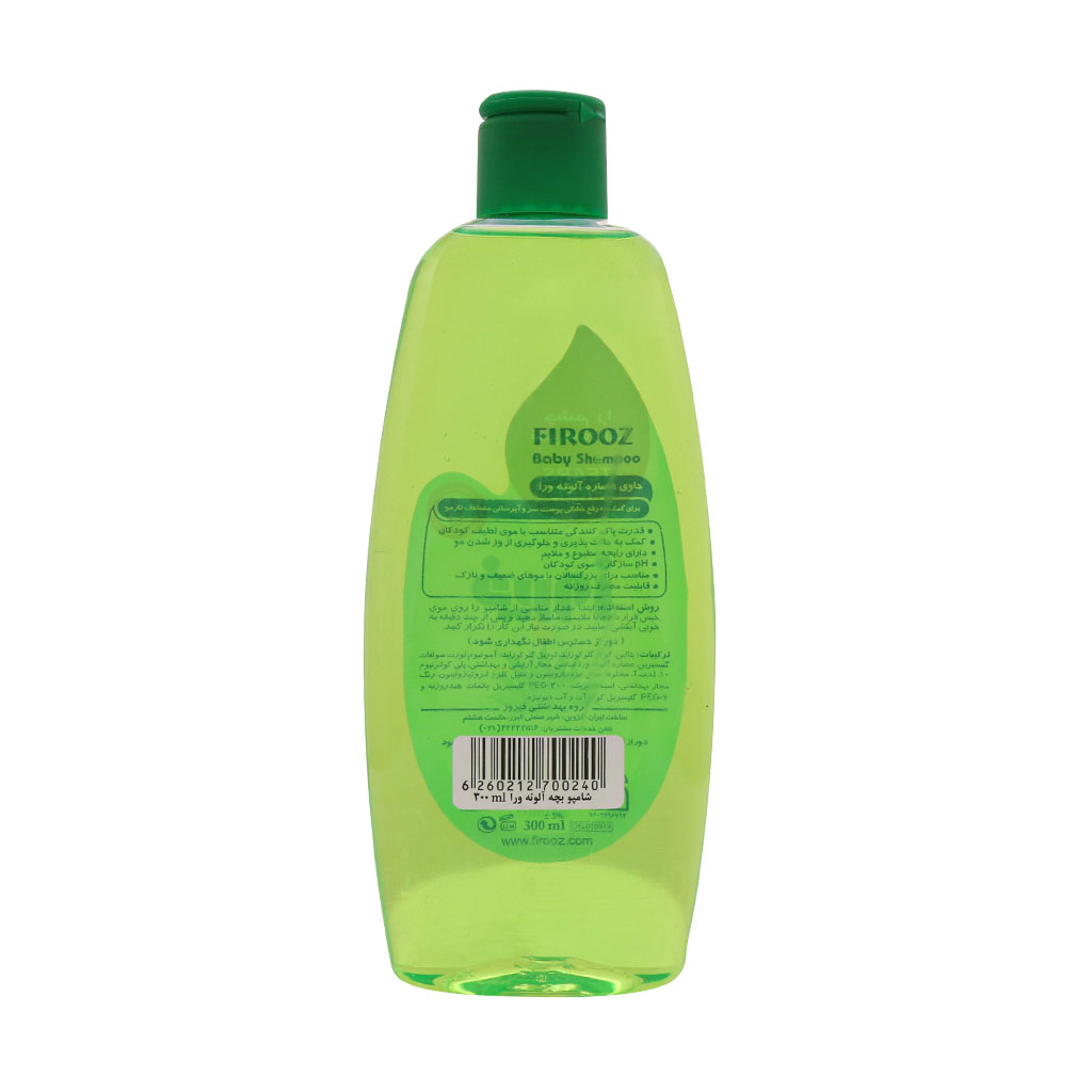 شامپو بچه آلوئه ورا فیروز با pH خنثی مناسب برای موی لطیف کودکان می باشد. این شامپو فاقد هرگونه مواد صابونی و الکلی می باشد، و عصاره آلوئه ورا موجود در این شامپو باعث کاهش التهاب پوست سر می شود. فرمولاسیون این شامپو به گونه ای است که در هنگام شستشو موجب اشک و سوزش چشم کودک نمی شود.