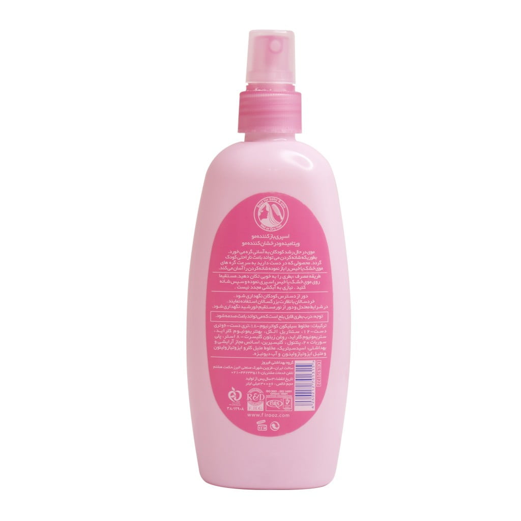 اسپری نرم کننده صورتی مو فیروز مدل DP با ایجاد لایه ای بر روی تارهای مو باعث نرم شدن و جدا شدن آنها از هم و باز شدن آسان گرهها میشود. موی نازک کودکان به دلیل ظرافت و نازکی خیلی سریع گره خورده و به هم میپیچند که باز کردن آن گاهی با بیقراری و گریه کودک مواجه میشود. اسپری موی فیروز به راحتی گرهی موی کودک را باز کرده و شانه پذیری موهای لطیف و ابریشمی او را راحتتر میکند.