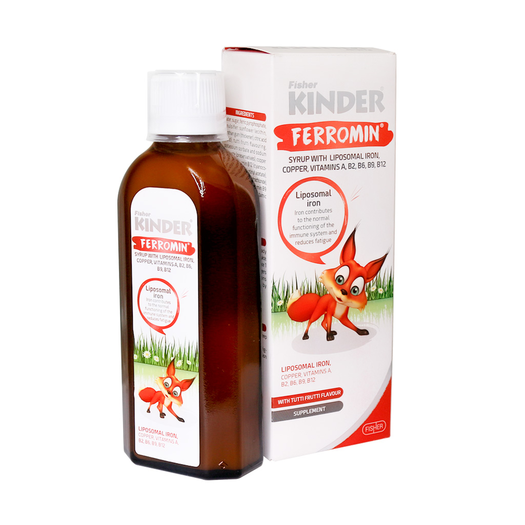 شربت فرومین فیشر کیندر حاوی آهن، ۴ نوع ویتامین و املاح ضروری (مس) برای کودکان و نوجوانان است که آهن مورد نیاز بدن، ویتامین و املاح ضروری (مس) را تامین می نماید.