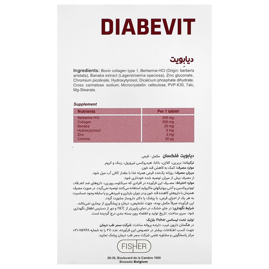 قرص دیابویت یک مکمل غذایی حاوی بربرین، بانابا، هیدروکسی تیروزول، کلاژن، زینک و کروم جهت کمک به کاهش قند خون است. قرص دیابویت در جعبه مقوایی 30 عددی (شامل 2 بلیستر 15 تایی) تحت امتیاز و لیسانس شرکت Fisher کشور بلژیک تولید شده و شرکت سمرطب درمان دارنده پروانه ساخت آن است.