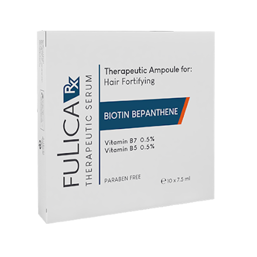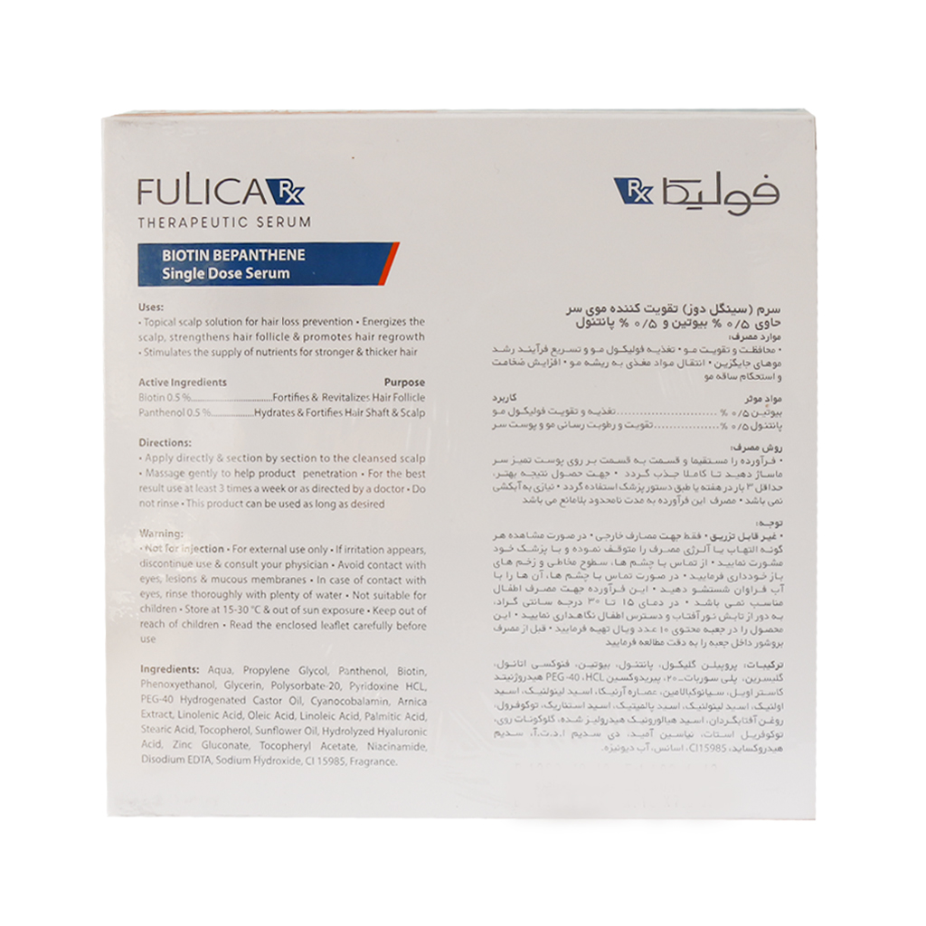 سرم تک دوز بیوتین بپانتین فولیکا آر ایکس حاوی 10 عدد ویال 7.5 میلی لیتری است. این سرم مو حاوی ویتامین B5 و B7 بوده که ضد ریزش، استحکام بخشی به ریشه مو، تسریع فرآیند رشد، افزایش ضخامت تارها و حفاظت از مو بر عهده آن است.