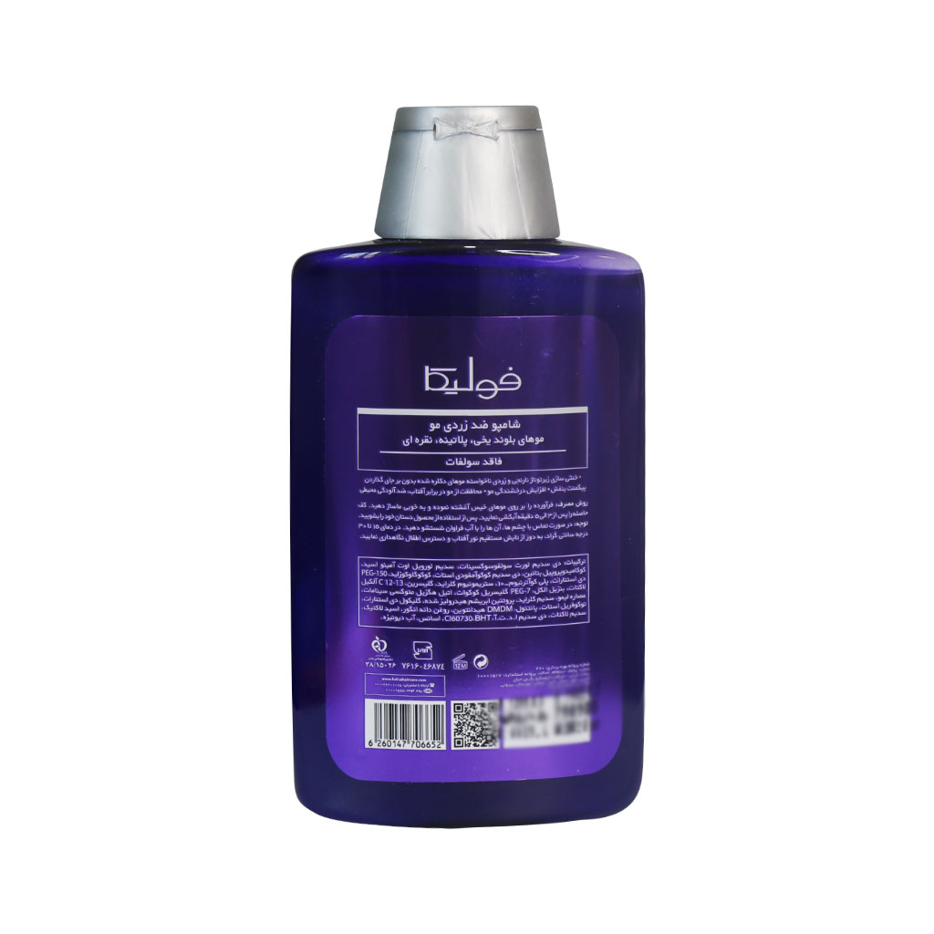 شامپو ضد زردی مو فولیکا برای موهای نقرهای، پلاتینه و بلوند یخی مناسب است. این شامپو فاقد سولفات بوده و موجب محافظت مو در برابر آفتاب و آلودگیهای محیطی میشود.