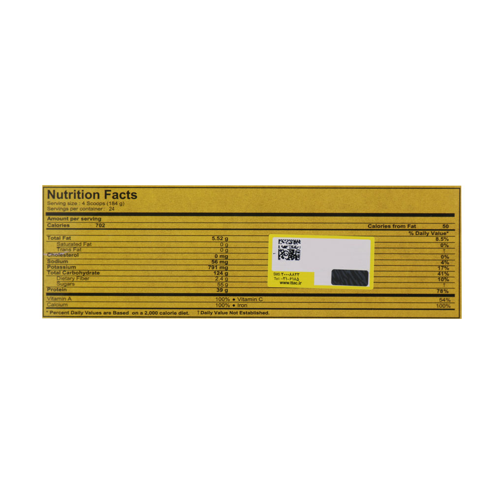 پروتئین غلیظ شده آب پنیر، پروتئین غلیظ شده شیر، پودر سفیده تخم مرغ، مالتودکسترین، دکستروز، لستین، سویا، عصاره مالت، پرمیکس ویتامینها و مواد معدنی، مجموعه آنزیمی، گوارگام، طعم دهندههای مجاز خوراکی