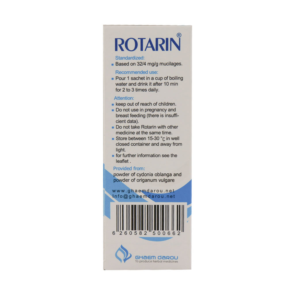 چهار تخمه روتارین متشکل از بذر گیاه کیدونیا ابلانگا یا همان دانه به و مرزنجوش نوعی مکمل گیاهی مشهور است که برای درمان سرفه به خصوص سرفههای مزمن تجویز میشود. از دیگر فواید داروی روتارین میتوان به رفع گرفتگی صدا، تسکین التهاب ریه، رفع عفونت و میکروب گلو و بهبود التهاب تارهای صورتی اشاره کرد. اثرگذاری روتادین به گونه ای است که حتی در اولین بار استفاده، بلافاصله اثر خود را نشان میدهد و شما شاهد معجزه پودر روتارین خواهید شد. قرص روتارین ساخت ایران است و عارضه جانبی خاصی برای مصرف کننده ایجاد نخواهد کرد.