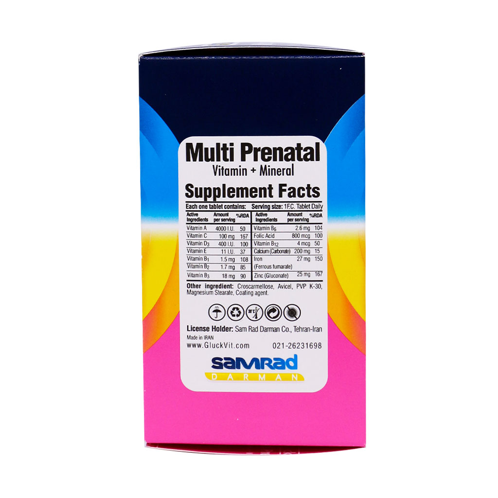 قرص روکش دار مولتی پریناتال گلوک ویت حاوی انواع ویتامینها و مواد معدنی مورد نیاز مادر و جنین است. این مکمل کمک شایانی به رشد جنین و سلامت مادر میکند.