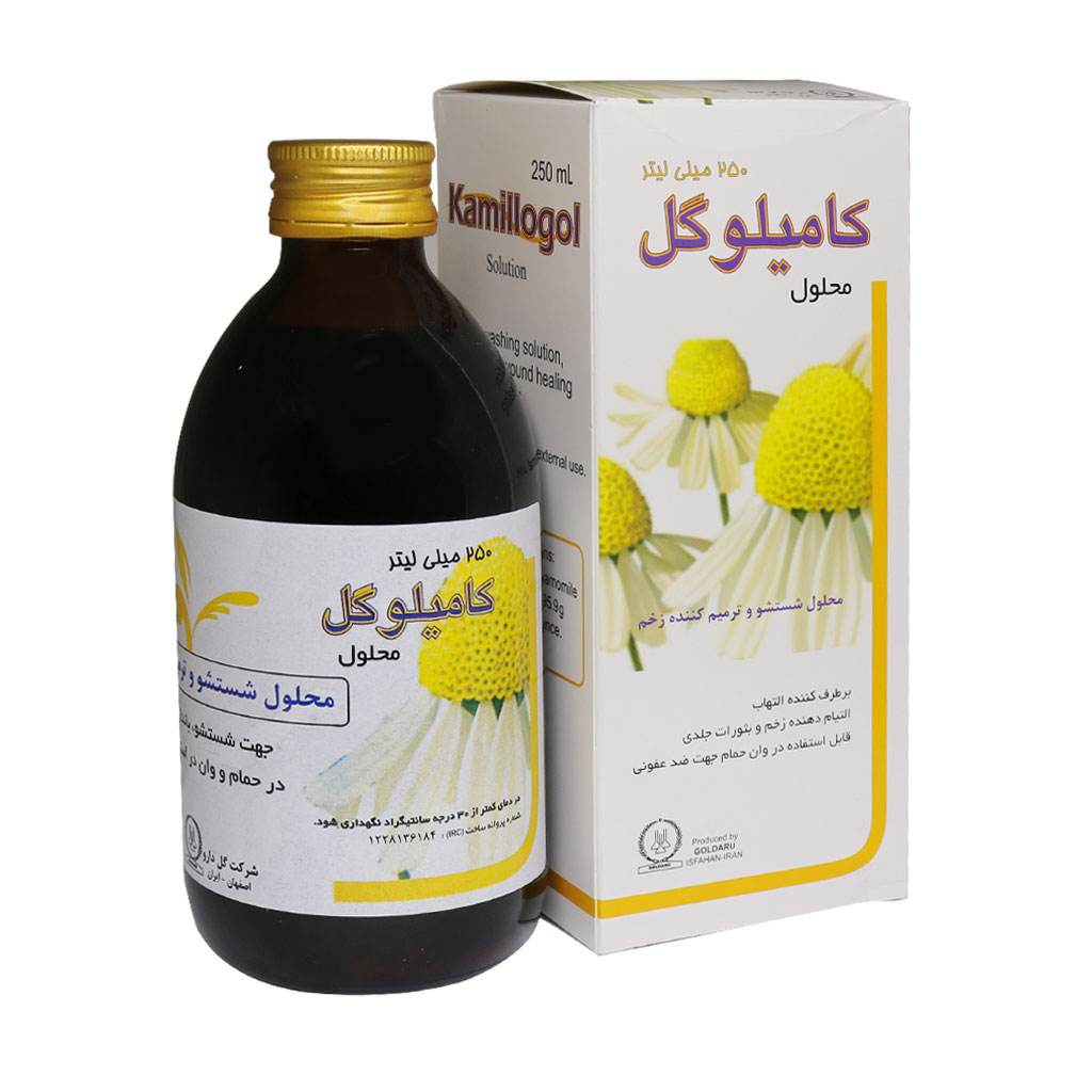 محلول کامیلوگل گل دارو با داشتن عصاره بابونه یک محصول مناسب جهت شستشو و ترمیم کننده زخم، بانداژ و استفاده در حمام و وان است.