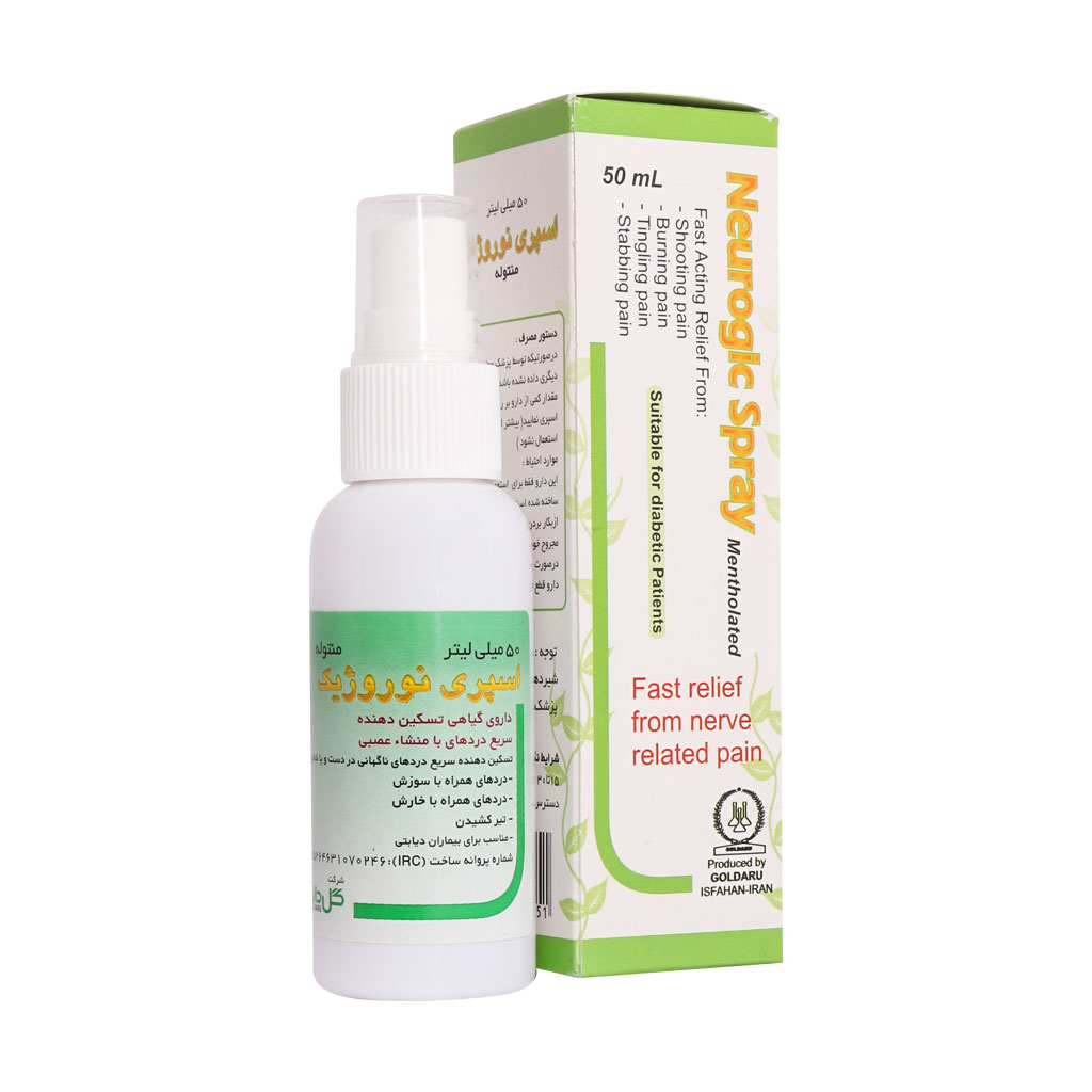 اسپری نوروژیک منتوله گل دارو با داشتن ترکیبات گیاهی و منتول یک داروی ضد درد است. با استفاده از این اسپری می‌توانید دردهای عصبی، شکستگی‌های استخوانی و دردهای نوروپاتی دیابتی را تسکین دهید.