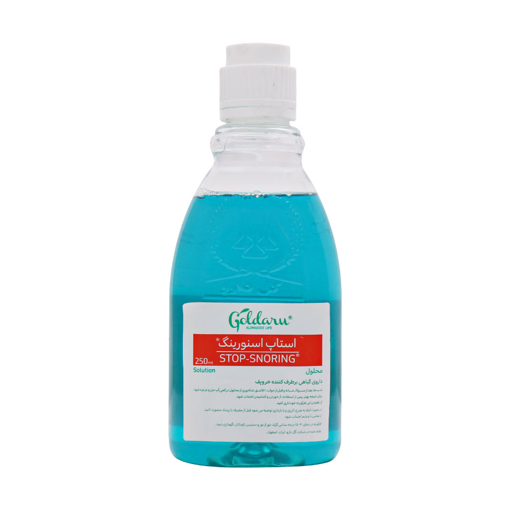 محلول استاپ اسنورینگ گل دارو فرآورده‌ای گیاهی حاوی عصاره گیاهان مختلفی مانند مریم گلی، میخک، اسطوخودوس و … است. درواقع این محلول یک دهانشویه برای رفع اسپاسم‌های مجاری تنفسی و ضد عفونی کنندگی گلو بوده و نقش بسیار مهمی در حفظ و افزایش سلامت دستگاه تنفسی دارد. ناگفته نماند از این محلول بیشتر برای رفع خرو و پف استفاده می‌شود. به این صورت که فرد مبتلا به خروپف شب‌ها خواب راحت تری خواهد داشت و در طول روز نیز احساس خستگی و خواب آلودگی نخواهد کرد. استفاده از محلول استاپ اسنورینگ Stop Snoring بسیار آسان است و به سرعت اثر خود را ایجاد می‌کند.