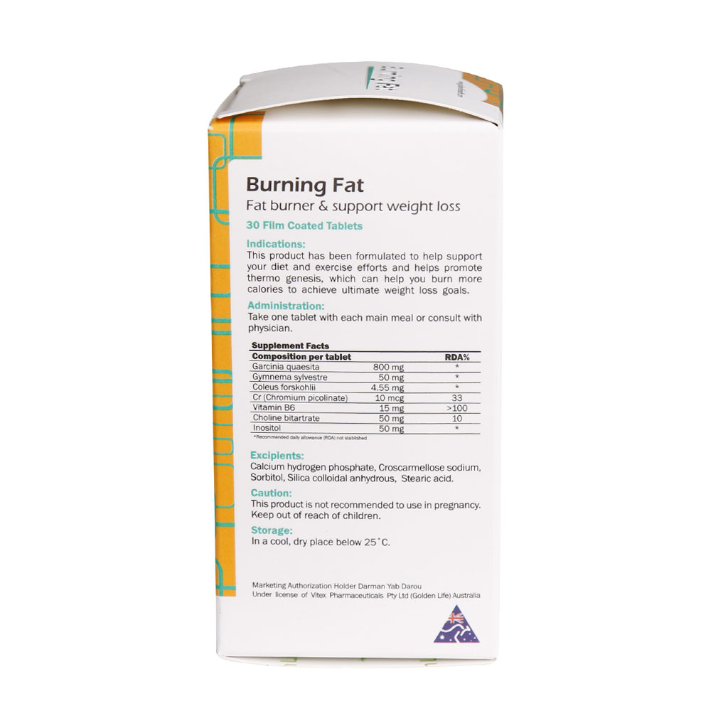 قرص برنینگ فت گلدن لایف از طریق افزایش سوخت و ساز بدن، مصرف کالری بیشتر، کاهش اشتها و کاهش ذخایر چربی به کاهش وزنی موثر و بدون عارضه در کنار رعایت رژیم غذایی و فعالیت بدنی مناسب کمک میکند. برنینگ فت یک محصول عالی گیاهی جهت کاهش اشتها و کاهش وزن است. ترکیبات موجود در قرص روکش دار برنینگ فت گلدن لایف شامل میوه استوایی گارسینیا، گیاه کولئوس و جیمنما است که نقش مهمی در افزایش سوخت و ساز بدن، کاهش بافت چربی و کنترل اشتها دارد. ویتامین ب ۶ و کرومیوم موجود نیز نقش مهمی در کاهش اشتها و مهار میل به شیرینی جات ایفا میکنند. این قرص لاغری و چربی سوز تحت لیسانس شرکت وایتکس (گلدن لایف) استرالیا و در شرکت درمان یاب دارو تولید و بسته بندی میشود.