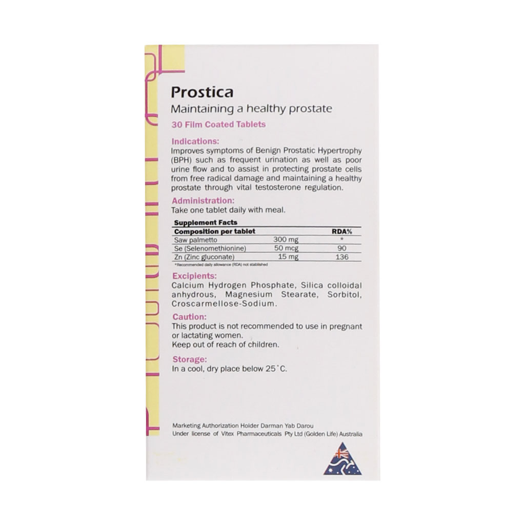 قرص پروستیکا گلدن لایف مکملی منحصر به فرد حاوی ساوپالمتو، سلنیوم و زینک گلوکونات بوده که جهت بهبود علائم التهاب خوش خیم پروستات مانند تکرر ادرار یا خروج ضعیف ادرار استفاده میشود. این محصول از سلولهای پروستات در مقابل صدمات رادیکالهای آزاد محافظت کرده و به حفظ سلامت پروستات کمک میکند. با این ویژگیها میتوان گفت این مکمل بهترین قرص پروستات است. همچنین ترکیبات آن به گونهای در نظر گرفته شده اند که تستسترون را تنظیم میکنند و آن را در شرایط بهتری قرار میدهند. این قرص همچنین به عملکرد طبیعی کبد کمک میکند تا سلولهای کبدی در بدن بازسازی شوند. پروستیکا از بدن و به ویژه کبد در مقابل آلودگیها و سموم ناشی از آن از بدن مراقبت میکند. قرص پروستیکا برای ریزش موی وابسته به هورمون مردانه کاربرد دارد.