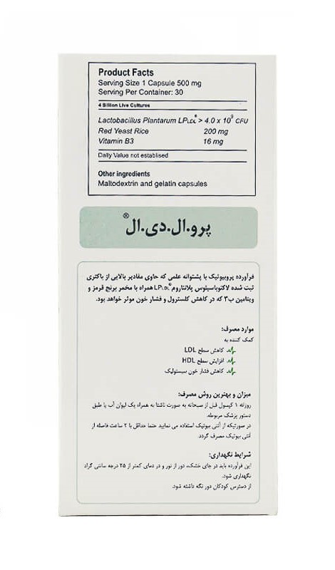 - پرو ال دی ال، مکمل پروبیوتیک حاوی لاکتو باسیلوس، مخمر برنج قرمز و ویتامین B3