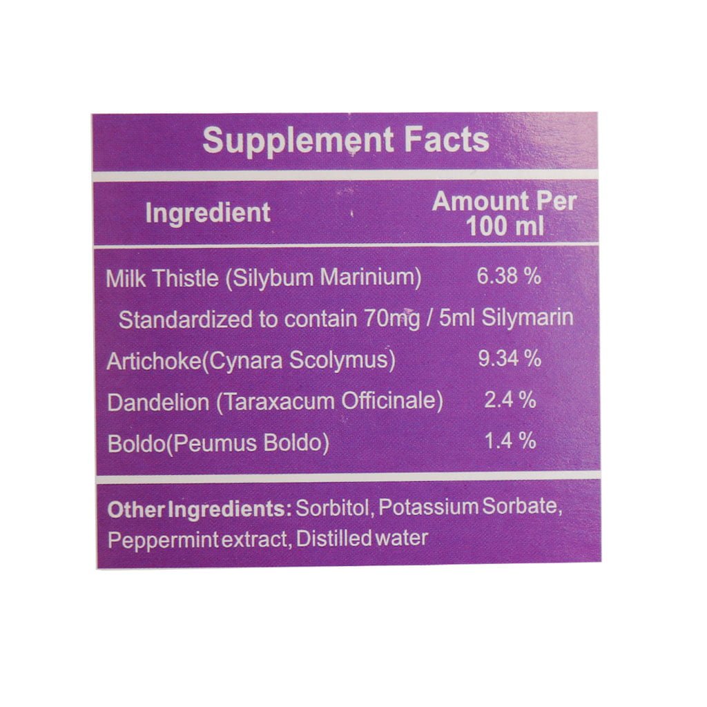 هر 100 میلی لیتر از این شربت حاوی عصاره هیدروالکلی گیاه خار مریم به میزان 38/6%، عصاره هیدروالکلی گیاه کنگر فرنگی به میزان 34/9%، عصاره هیدروالکلی ریشه گیاه گل قاصد به میزان 4/2% و عصاره هیدروالکلی برگ گیاه بولدو به میزان 4/1% که بر اساس سیلیمارین استاندارد شده است.