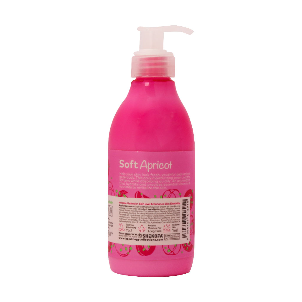 کرم آبرسان پمپی سافت اپریکات هندولوژی حاوی شی باتر و ویتامین E یک آبرسان قوی برای پوست دست، صورت و بدن است. این محصول با رایحه ملایم زردآلو، پوست را به خوبی نرم و تغذیه رسانی میکند.