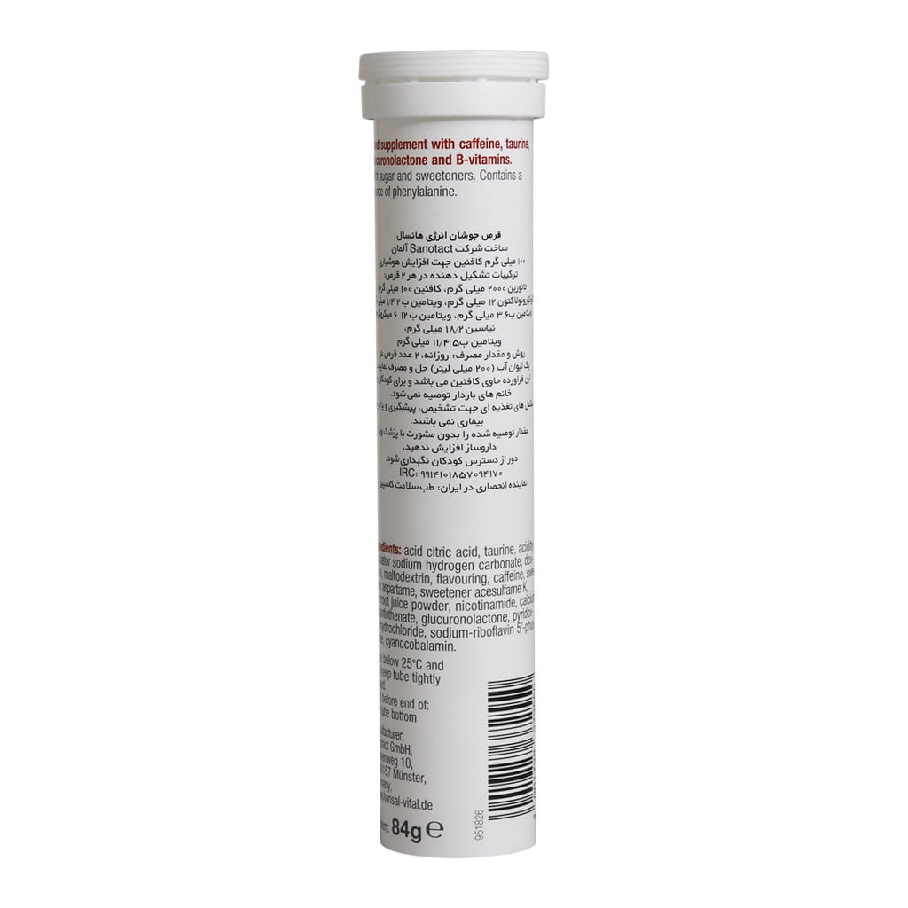 قرص جوشان انرژی هانسال حاوی کافئین بالا و تائورین می باشد که به افزایش توان جسمی و کاهش خستگی بدن کمک می کند. این قرص حاوی ویتامین های گروه B می باشد.