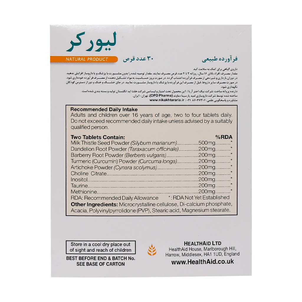 قرص لیورکر هلث اید دارای ترکیبی گیاهی است که برای حفظ سلامت و عملکرد طبیعی کبد در زنان و مردان مورد استفاده قرار می گیرد. این قرص از آسیب های ناشی از مسمومیت کبد پیشگیری می نماید. بهترین جایگزین این محصول کپسول ژلاتینی لیورمد فیتومد 30 عدد است.