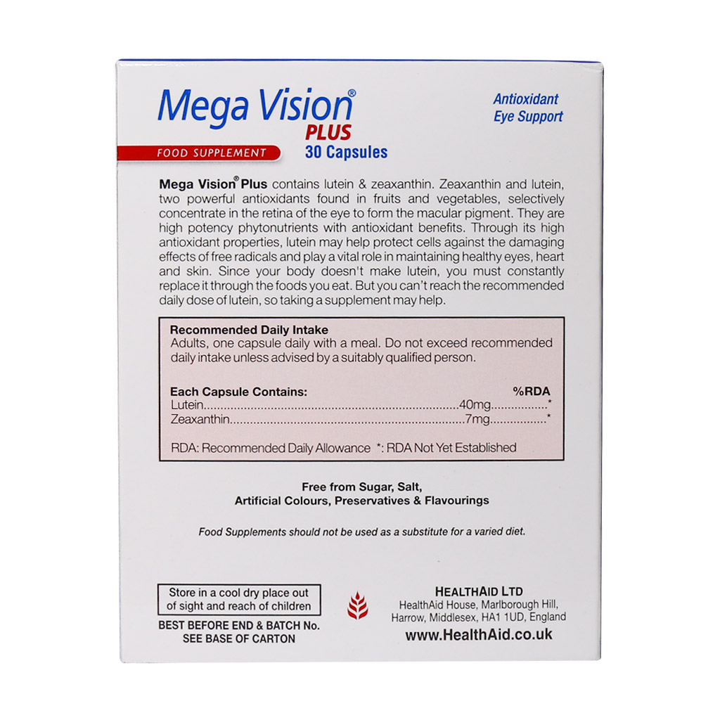 کپسول مگا ویژن 30 عددی حاوی 40 میلی‌گرم لوتئین (برگرفته از گل همیشه بهار)، با افزایش چگالی رنگدانه ماکولا از ابتلا به دژنراسیون ماکولا (تخریب لکه زرد) جلوگیری نموده و ضخامت ماکولای چشم (قسمت حساس به نور شبکیه و مسئول دید مستقیم و واضح) و ضمن کاهش خطر ابتلا به آب مروارید و کمک به کاهش خستگی چشم، باعث بهبود عملکرد بینایی و تقویت بافت چشم می‌شوند. لوتئین که از آن به عنوان ویتامین چشم نیز یاد می‌شود، در کاهش التهاب و بیماری‌های التهابی چشم بسیار موثر بوده و با مهار از دست رفتن بیش از اندازه رطوبت چشم، به عنوان یک عامل تاثیرگذار در درمان خشکی چشم نیز موثر است.