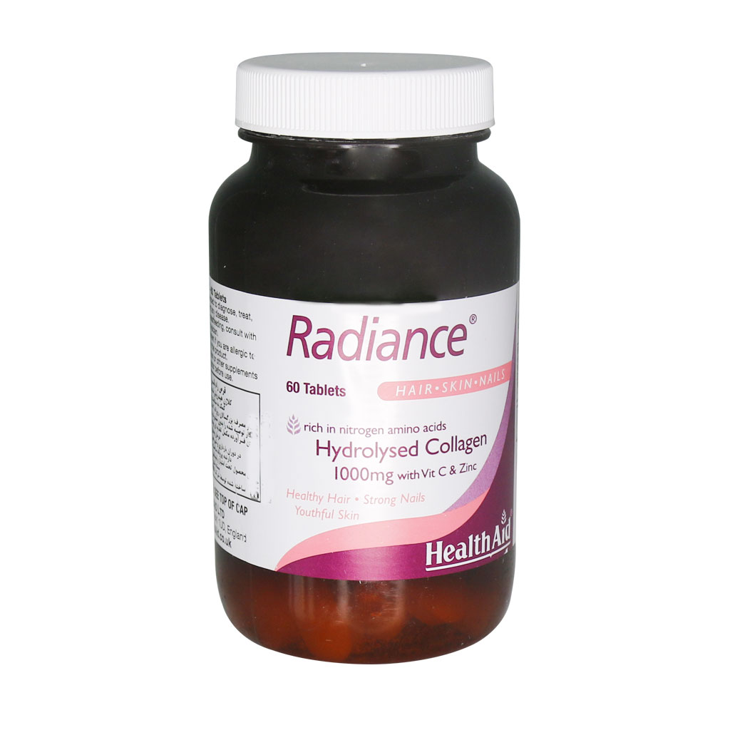 قرص رادیانس هلث اید تحت امتیاز و لیسانس شرکت هلث اید انگلستان تولید شده است. این محصول با داشتن کلاژن هیدرولیز شده، ویتامین C و روی یک مکمل ایده آل جهت سلامت پوست، مو و ناخن به شمار میآید. مصرف این قرص میزان کلاژن را در بدن افزایش داده و به همین دلیل است که بعد از استفاده پوست تان درخشان تر میشود.