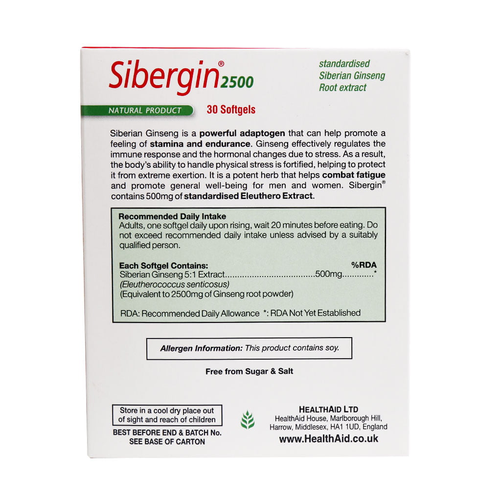 کپسول ژلاتینی سیبرجین 2500 میلی گرم هلث اید حاوی معادل 2500 میلی گرم جینسینگ سیبری استاندارد شده است. این کپسول با خواص آنتی اکسیدانی بسیار بالا سبب افزایش سطح انرژی بدن میشود. علاوه بر آن کپسول جینسینگ ایرانی هلث اید حاوی نیاسین، اسیدهای آمینه، کربوهیدرات و سایر ویتامینها و مواد معدنی است که برای افزایش سلامت زنان و مردان در تمامی سنین بسیار موثر عمل میکند.